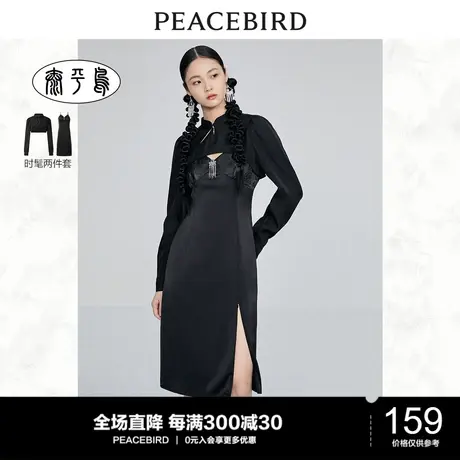 太平鸟国风两件式旗袍连衣裙夏季新款拉链开叉吊带小黑裙长裙